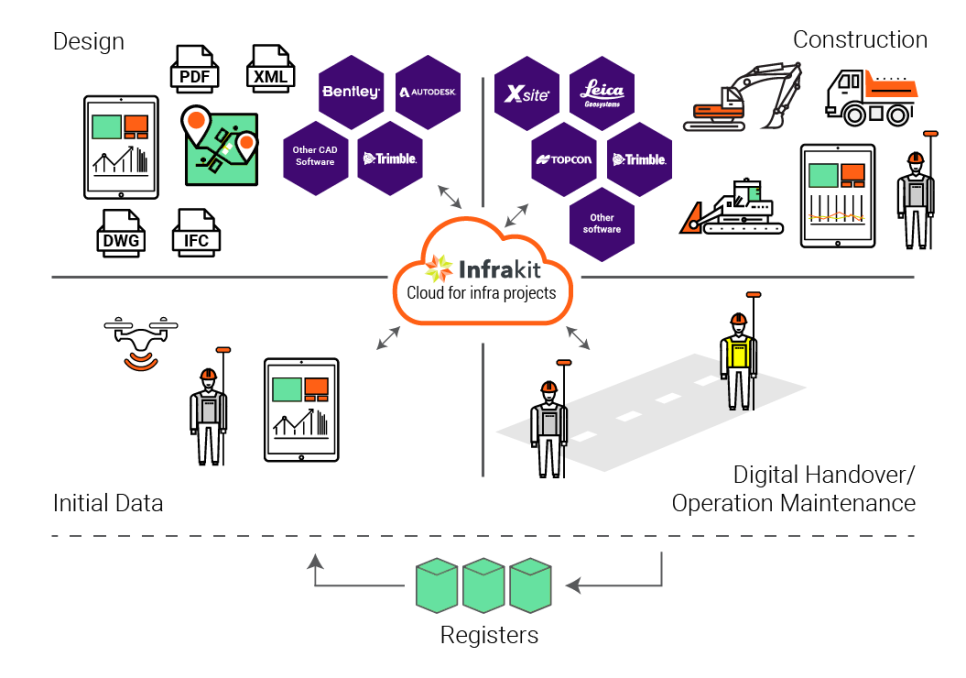 인프라킷은 위의 그림 하나로 잘 설명될 수 있겠습니다. 중앙의 구름 모양의 클라우드 플랫폼에 좌측 상단의 오토데스크나 벤틀리 등 각종 툴로 만들어진 데이터를 업로드하게 됩니다. 우측 상단의 그림처럼 다양한 브랜드의 머신 가이던스, 측량 기기, 트럭 등의 정보가 연결되고요. 좌측 하단의 드론 등을 통한 원지반 데이터까지 이러한 모든 정보가 설계사, 감리, 시공사, 발주처, 현장 관리자, 장비가 브랜드 관계 없이 모두 실시간 최신의 것으로 동기화되는 겁니다.