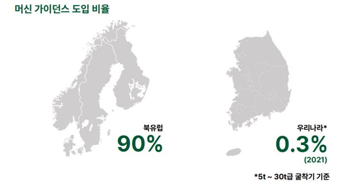 북유럽 장비주들에겐 자연스러운 일어었던 겁니다. 우리나라는 머신 가이던스 장착 건 수가 3D 기준 연간 30~50대 수준으로, 도입 비율이 낮지만, 엔트리급으로 불리는 2D 머신 가이던스는 연간 200~300대 정도 장착이 되고 있습니다.