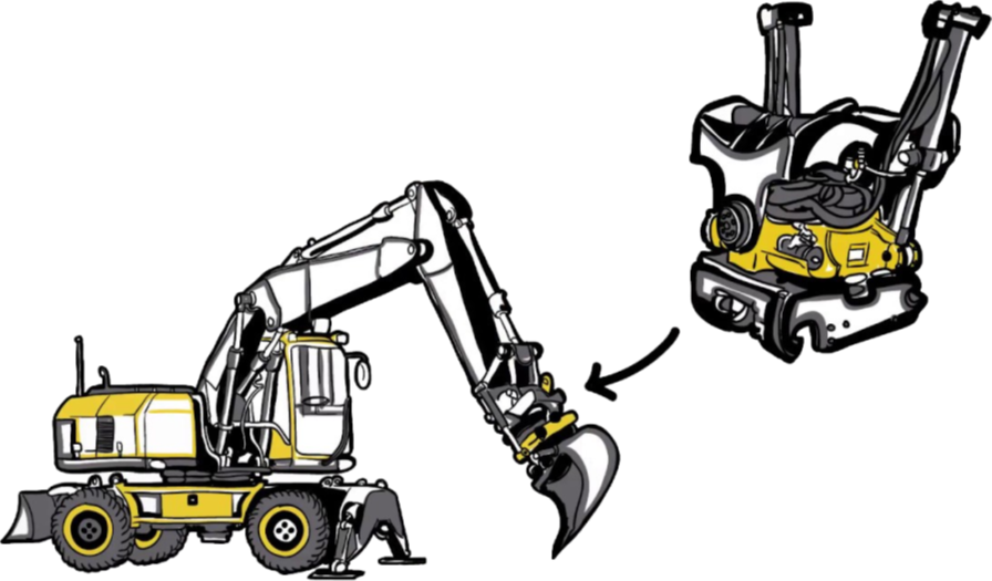 앞서 보여드린 영상처럼 틸트로테이터는 자유로운 동작이 가능한 손목 관절인 것이고, 그러한 관절에 집게나 지게발 같은 여러 작업 장치를 붙여 사용하게 됩니다. 기존에는 이 때 유압 호스를 연결해야 하는데, 보통 호스 교환 시 남아 있는 압력을 제거하고 운전석에서 내려 호스를 빼고 연결하는 작업이 10분 정도 소요됩니다. 하루에 6번 교체하면 60분, 즉 한 시간이 소요되는 셈입니다.