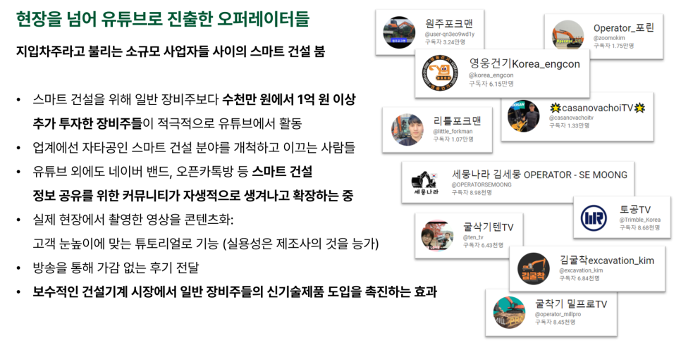 게다가 예전에는 장비 운전을 배우려면 대부분 목마 타듯이 운전석 머리맡에 쪼그리고 앉아서 배웠다고 하는데요. 요즘은 유튜브를 통해 다양한 배움의 기회가 주어지는 것도 스마트 건설 장비 도입에 한 몫 하는 것 같습니다. 대표적인 분들이 위 이미지에 보이는 분들입니다. 수만 명의 구독자를 거느리며 글로벌 인플루언서로서의 위상을 꿰찬 분들도 계십니다.