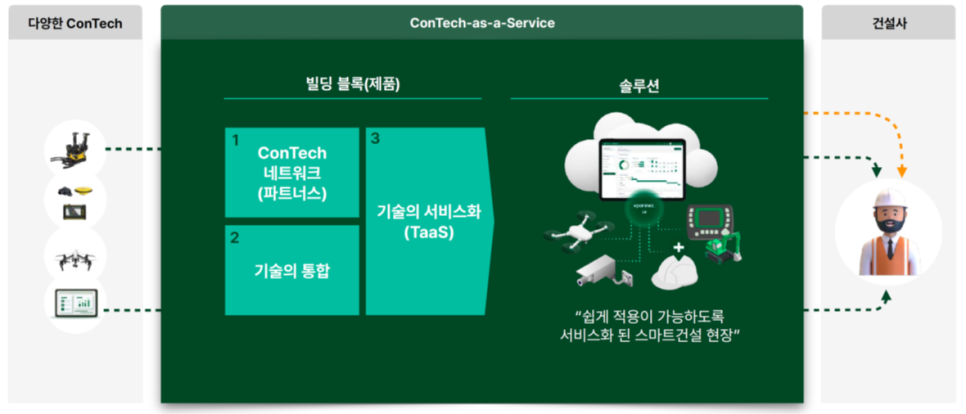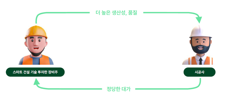 어쩌면 이렇게 되는 것이 당연할 겁니다. 장비주는 다양한 스마트 건설 기술에 투자해서 더 높은 생산성을 현장에 제공하고, 이를 통해 시공사는 더 많은 수익을 얻게 되어 장비주의 일대를 더 올려주고. 그러면 장비주는 투자 회수에 대한 믿음이 생겨 다시 더 좋은 기술에 투자하는 선순환을 일으키는 모습입니다. 하지만 스마트 건설기술의 복잡성과 다양성, 그리고 증명되지 않은 생산성과 낮은 인지도 등으로 이런 순환 구조가 만들어지기 어렵다는 게 현실이었죠. 저희가 그 일을 주도해서 시장에 마중물을일으켜보자는 생각을 했습니다.
