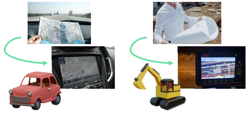 먼저 모델 기반 시공에 대해 말씀드리려고 합니다. 머신가이던스에 대해 잘 아시는 분도 많으시겠지만 설명을 드리자면, 머신가이던스는 자동차의 내비게이션과 유사합니다. 예전에는 차에 지도책을 한 권씩 두고, 표지판과 지형지물 등을 지도와 대조해 가면서 목적지를 찾아갔었습니다. 하지만 요즘에는 모든 차에 내비게이션이 장착되어 있거나, 휴대폰의 내비게이션 앱을 사용합니다.