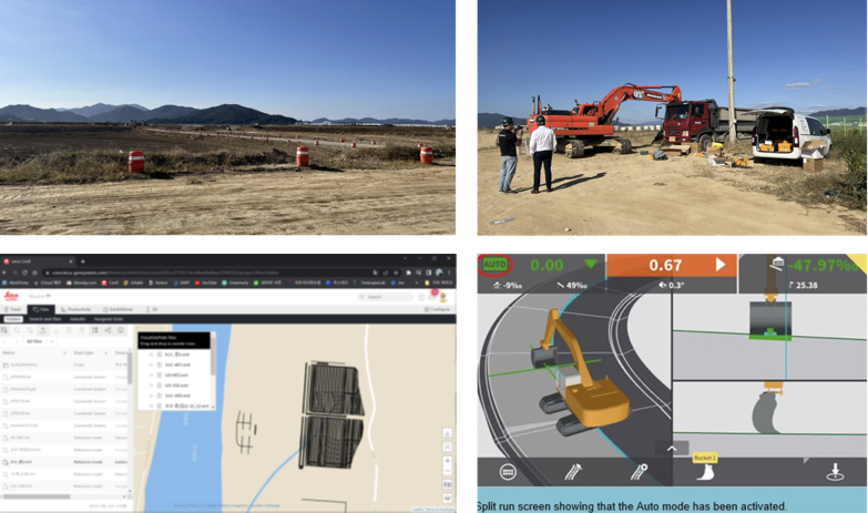 왼쪽 상단 사진은 부산 에코델타스마트시티의 2-4 공구인데요. 왼쪽 하단의 웹페이지와 우측 하단의 운전자 화면은 덴마크 Leica Geosystems사의 제품입니다. 웹페이지 통해 현장 좌표계와 시공 도면을 원격으로 장비에 전송해서 작업하고 있는데, 왼쪽 하단의 검은 형상이 예시 화면으로 삽입된 토공 도면입니다. 이 지역에 대략 3개사 머신 가이던스 제품이 운용되고 있는 것 같습니다.