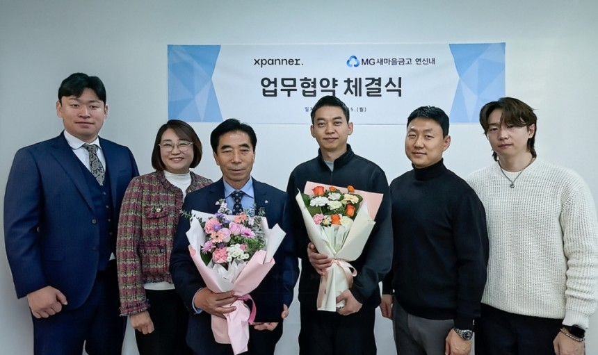 업무협약 체결식에 참석한 양사 임직원이 기념촬영에 임하고 있다. (왼쪽부터) 연신내새마을금고 김창웅 팀장, 안윤희 전무, 김영적 이사장, 스패너 박주한 대표, 전진영 이사, 김길수 팀장